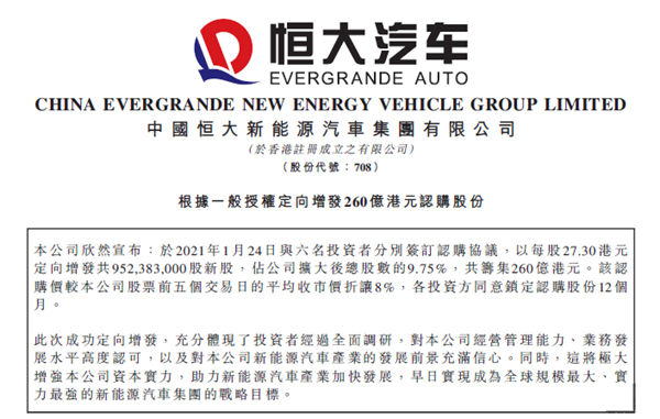 1月24日,恒大汽车发布公告,按前五个交易日平均收盘价折让8%的价格,向6名投资人定向增发9.52亿股新股,共引资260亿港元,各投资方自愿锁定12个月,这也是新能源汽车行业最大规模的股权融资之一,充分证明了资本对恒大汽车的高度认可和充足信心。