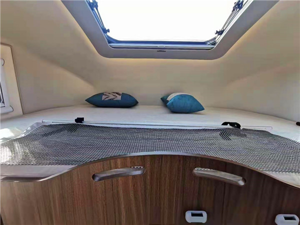内饰布局采用的是客厅L型沙发座椅+后纵置双人床+额头床,是一般常见的布局,内饰家具则采用深色系列;驾驶上方是常见的额头床部位设计,配置了大尺寸弧形外推窗、两侧小尺寸房车窗、防掉网等,提供舒适的卧室环境;床板向上翻折后是32寸的高清液晶网络电视屏。