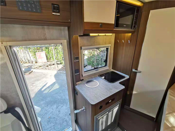 车辆内部的中间位置,是属于会客厅区域,会客区配备有一张L型的卡座沙发,这款沙发采用的是人工体学设计,在舒适性方面具有极高的优势,尤其是在长途旅行的时候,因此也算是一款房车专用沙发,在沙发的中间是一个可自由升降的餐桌,并且餐桌的尺寸设计刚刚好能够与沙发并列组成一张临时的单人床位。