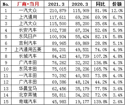 3月份市占率分析:在入榜的15家车企中,德系(四家)市占率为25.5%,较上月提高0.7个百分点;日系车(五家)22.3%,较上月提高1.4个百分点;自主品牌(五家)23.3%,较上月下滑2.3个百分点;美系车(一家)6.7%,与上月持平;15家合计占有狭义乘用车零售市场的77.9%,比上月下滑2.5%。奇瑞汽车本月再度入榜。