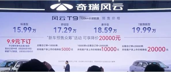 4月18日晚,奇瑞风云T9正式预售,预售价格区间为15.99-19.99万元。作为奇瑞风云新能源产品序列的全新车型,风云T9提供5座和7座可选,搭载鲲鹏超能C-DM混动系统,综合续航将超过1400km。
