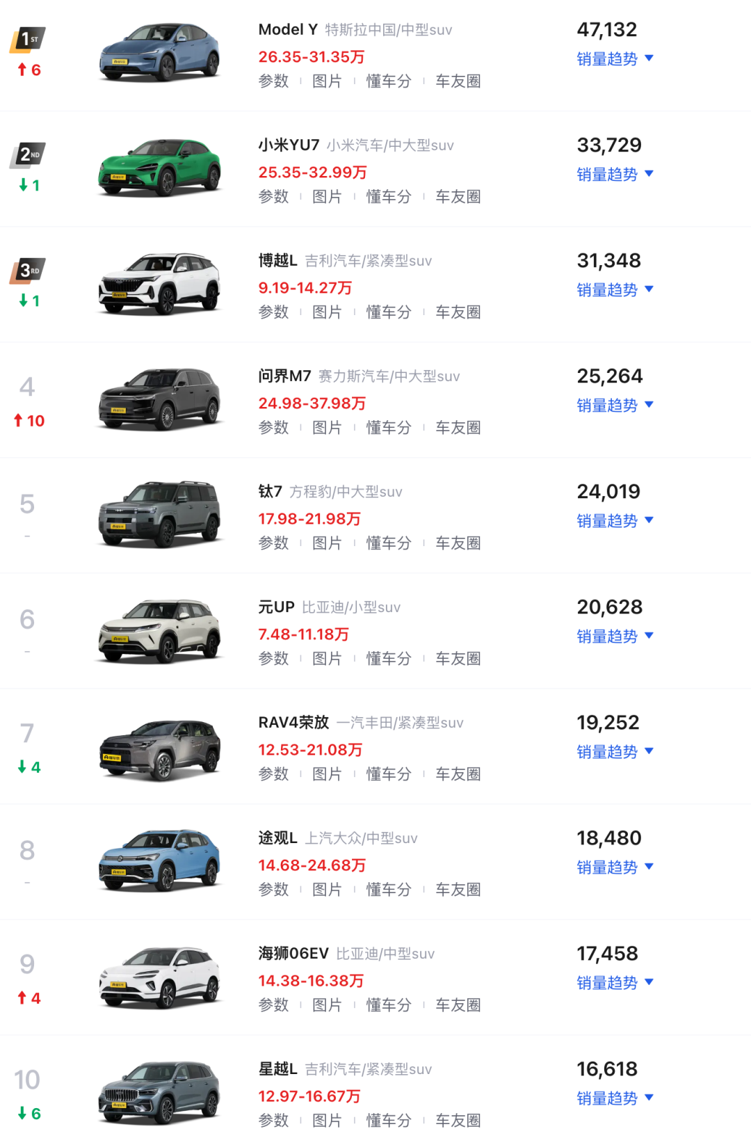 首先来看轿车销量榜,前十车型中有4款车型销量较10月排名提升,其中特斯拉Model 3排名大幅提升,较10月上升了43名,位列第六,当月销量为26013辆,为2025年以来单月最高销量表现。