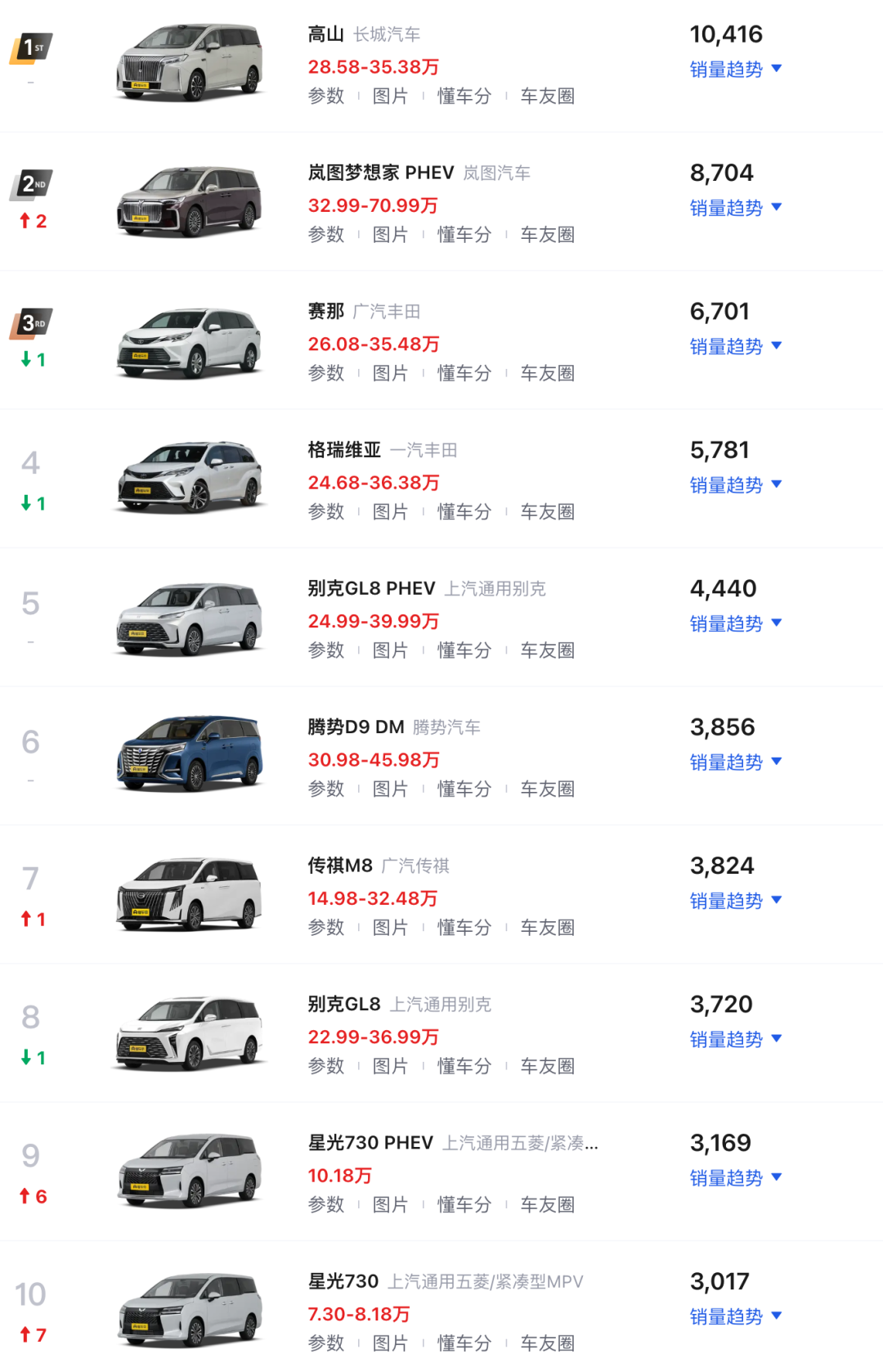 最后再来看MPV,魏牌高山是唯一销量过万的车型,为10416辆。岚图梦想家紧跟其后,为9027辆,其中纯电为323辆,插混为8704辆。11月12日上市的五菱星光730,填补了7-10万元MPV的市场需求,该车型提供燃油、纯电、插混三种动力,丰富消费者的购车选择,其中插混和燃油车市场表现最好,销量均超过3000台。从榜单来看,MPV榜主要以20万元以上的中高端车型为主,而且新能源MPV更受市场欢迎,前十中有七款车型拥有新能源版本,其中国产品牌MPV占据核心位置。