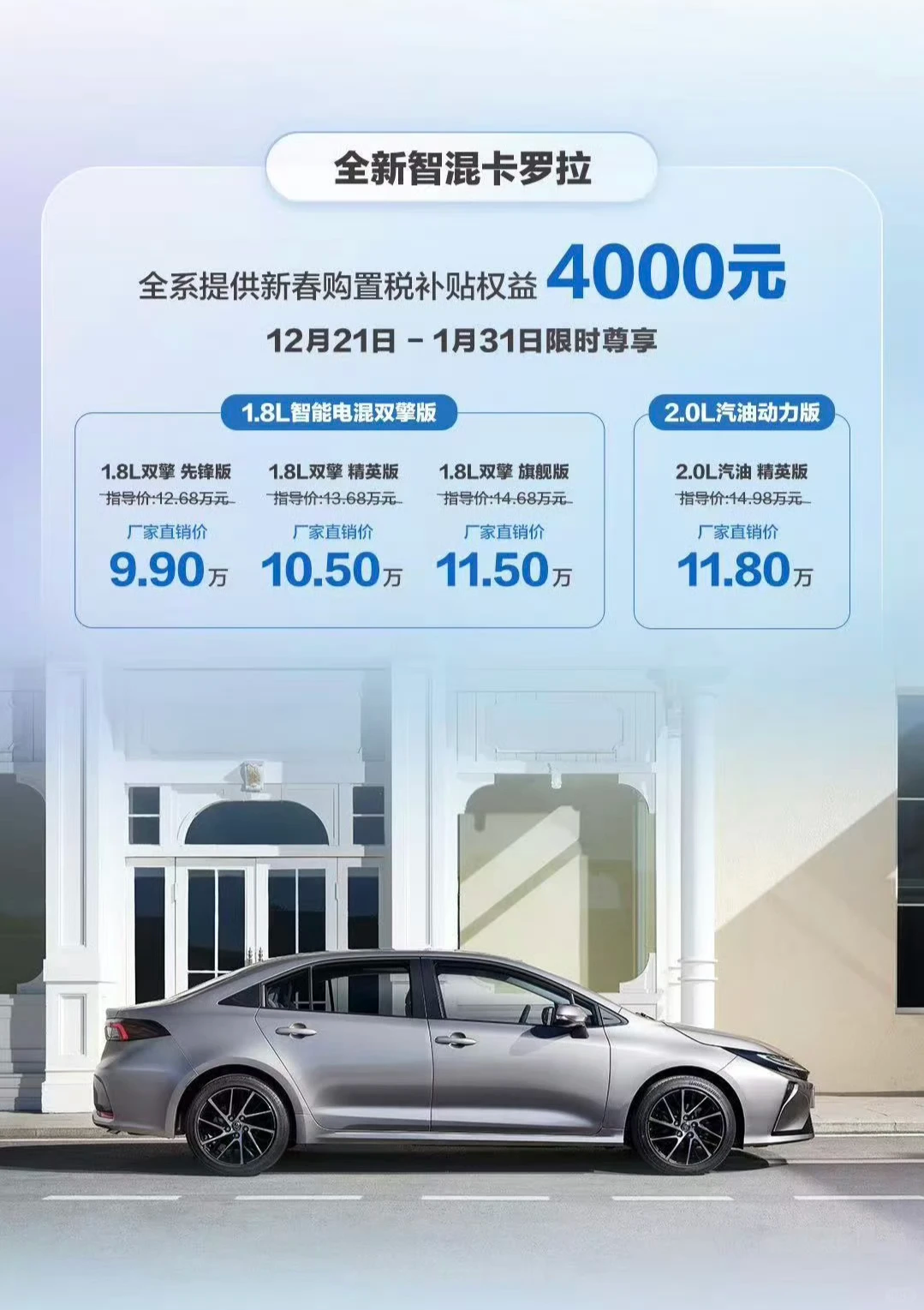 12月21日,一汽丰田新款卡罗拉正式上市,新车共推出4款车型,售价区间9.9-11.8万元。作为中期改款车型,新款卡罗拉针对外观和内饰进行升级,轴距相比在售卡罗拉加长50mm,与现款一汽丰田亚洲狮轴距一致,动力可选2.0升发动机和1.8升油电混动系统。