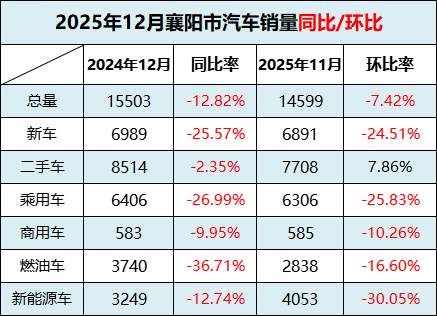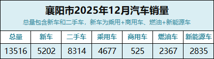 2025年12月,襄阳市汽车销售总量为13516辆,其中新车销售5202辆,占比38.49%;二手车销售8314辆,占比61.51%。