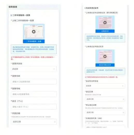 【旧车信息】在填报界面,有2个部分,一部分是旧车的《二手车销售统一发票》,一部分是旧车的《机动车登记证书》。