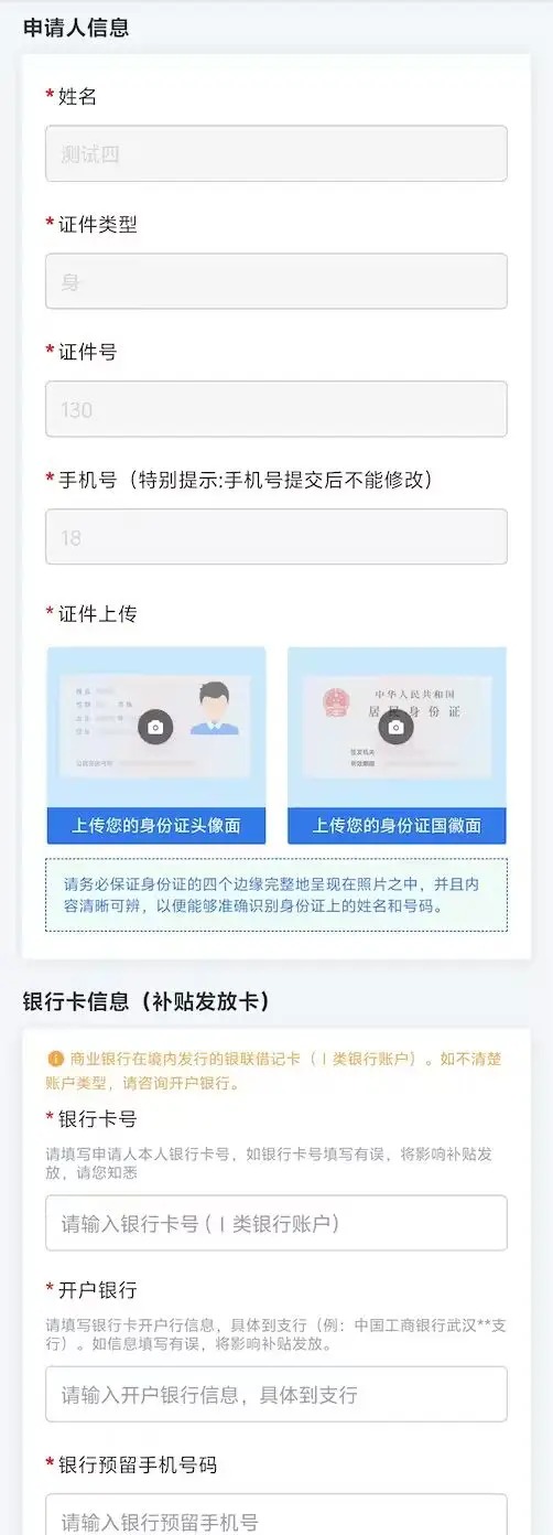 个人信息填报界面主要包含2部分,一部分是证件信息,需要用户根据页面提示上传申请人的《身份证件》。另外一部分是银行卡信息模块,需要申请人填写本人银行卡的开户银行、银行卡号、银行预留手机号信息。