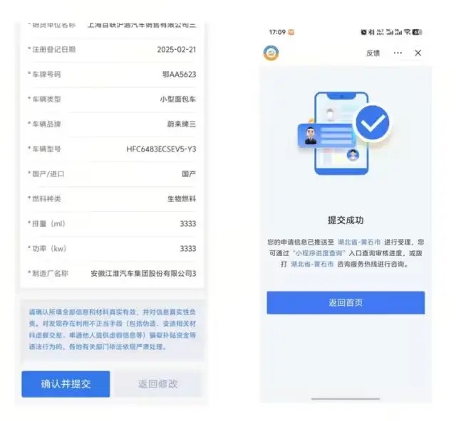 如果没有提示错误信息,此时需对信息进行确认,若需修改,点击【返回修改】进行补正;确认信息无误,点击【确认并提交】,提交后完成汽车置换更新补贴申请操作,进入受理审核环节。
