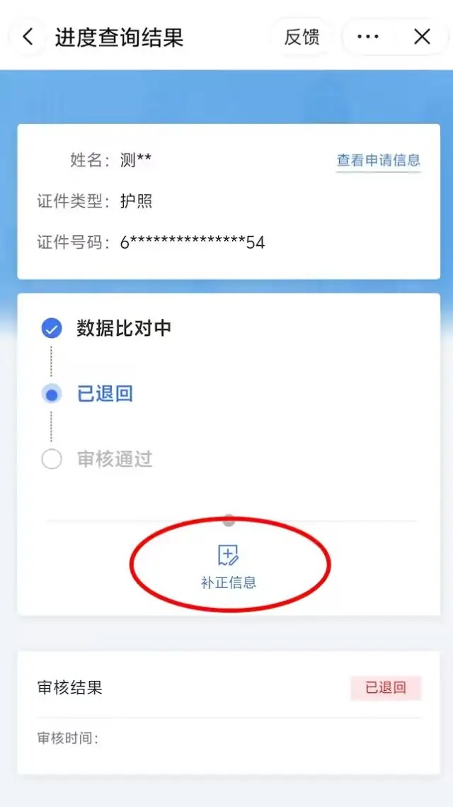 当审核退回时,可进行【补正信息】,补正后重新提交的信息,均需重新进入受理审核环节。