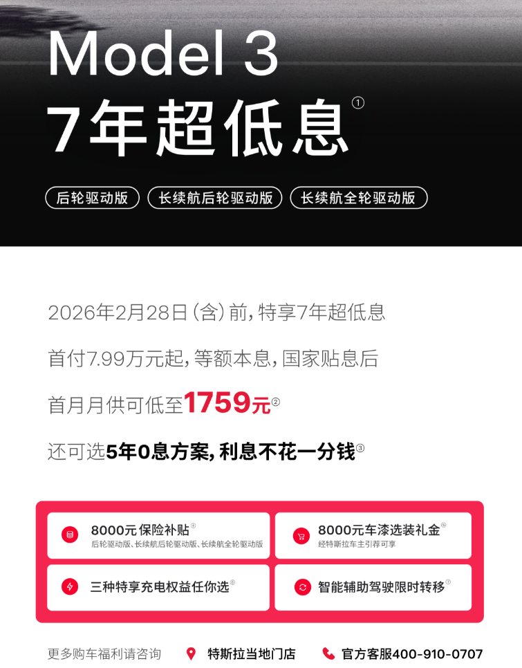 具体如下:2月28日前(含)下单可享7年低息金融方案,特斯拉Model 3后驱/长续后驱/长续全驱车型首付7.99万起,首月月供可低至1759元,并可选5年0息方案;同时,特斯拉Model Y后轮驱动/长续后轮驱动/长续全驱车型首月月供低至2188元。特斯拉Model Y L在2月28日(含)前下单可选5年0息方案,月供低至3985元,或选7年超低息方案,首月月供可低至2849元。