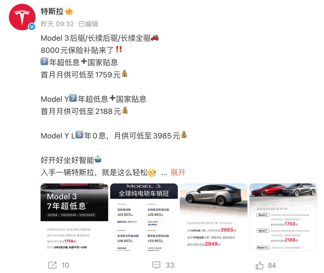 1月24日,特斯拉宣布,特斯拉Model 3、特斯拉Model Y以及特斯拉Model Y L三款车型部分配置推出8000元保险补贴,并推出7年超低息金融方案。