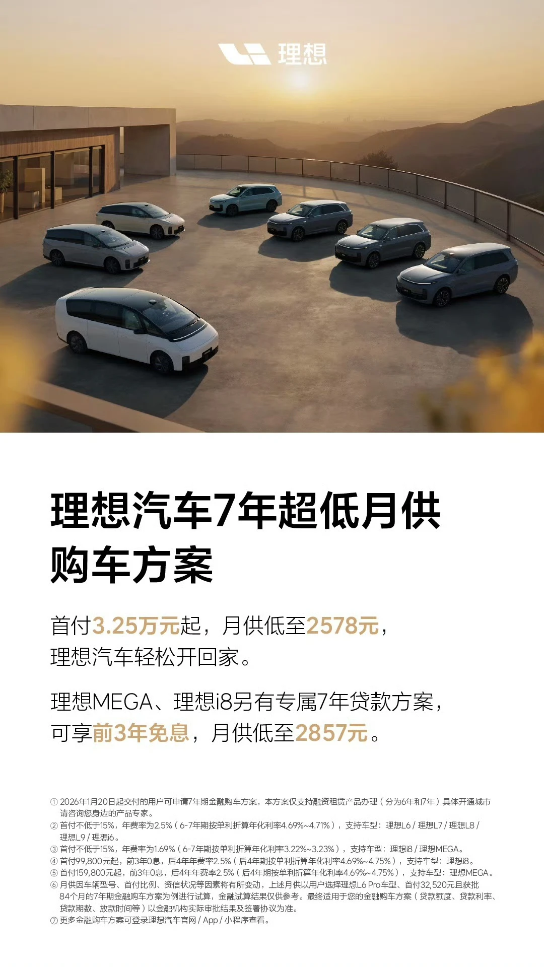 1月20日,理想汽车也发文称,2026年1月20日起购车,可享7年超低月供购车方案:首付3.25万元起,月供低至2578元。理想MEGA、理想i8另有专属7年贷款方案,可享前3年免息,月供2857元。具体来看,购买理想L6/L7/L8/L8/i6车型首付不低于15%,年费率为2.5%。购买理想i8/MEGA首付不低于15%,年费率为1.69%。理想i8享前3年0息,后4年年费率2.5%,首付9.98万元起。理想MEGA享前3年0息,后4年费率2.5%,首付15.98万元起。