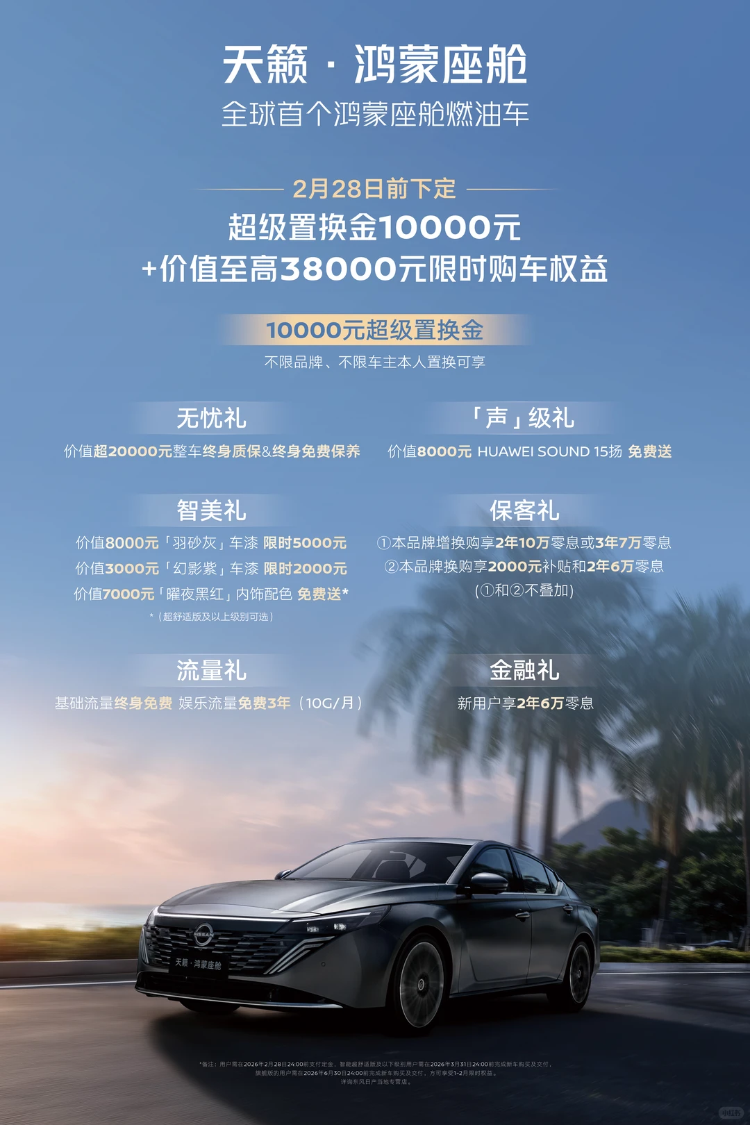 1月22日,东风日产针对探陆以及天籁·鸿蒙座舱两款车型推出限时优惠权益,包含至高2.1万的终身双保、1万元超级置换金以及2千元置换补贴等。根据官方海报展示,购买日产探陆、日产天籁·鸿蒙座舱限时可享至高2.1万终身双保,其中探陆享价值6000元动力总成终身质保、15000元终身基础保养;天籁·鸿蒙座舱享价值超20000元整车终身质保和终身免费保养。同时,两款车型还可至高享13000元置换补贴、叠加享受厂家超级置换金10000元等。金融政策方面,探陆可享权益三选一包含0首付/0利率/0月供;天籁·鸿蒙座舱新用户可享2年6万零息、本品增换购享2年10万零息或3年7万零息。除此之外,探陆车型购车可享送全险、限时赠送流量权益;天籁·鸿蒙座舱可享15枚HUAWEI SOUND 15扬声器、限时流量权益以及部分车漆限时优惠等。