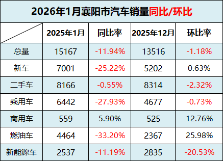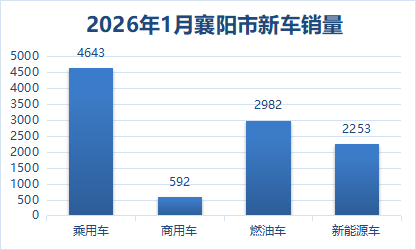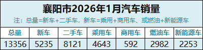 2026年1月,襄阳市汽车销售总量为13356辆,其中新车销售5235辆,占比39.20%;二手车销售8121辆,占比60.80%。