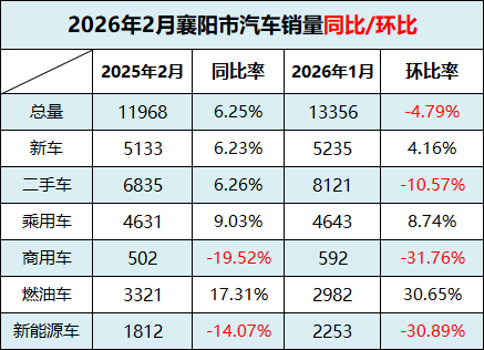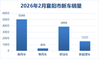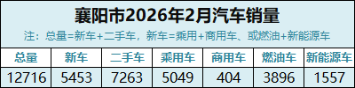 2026年2月,襄阳市汽车销售总量为12716辆,其中新车销售5453辆,占比42.88%;二手车销售7263辆,占比57.12%。